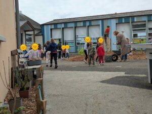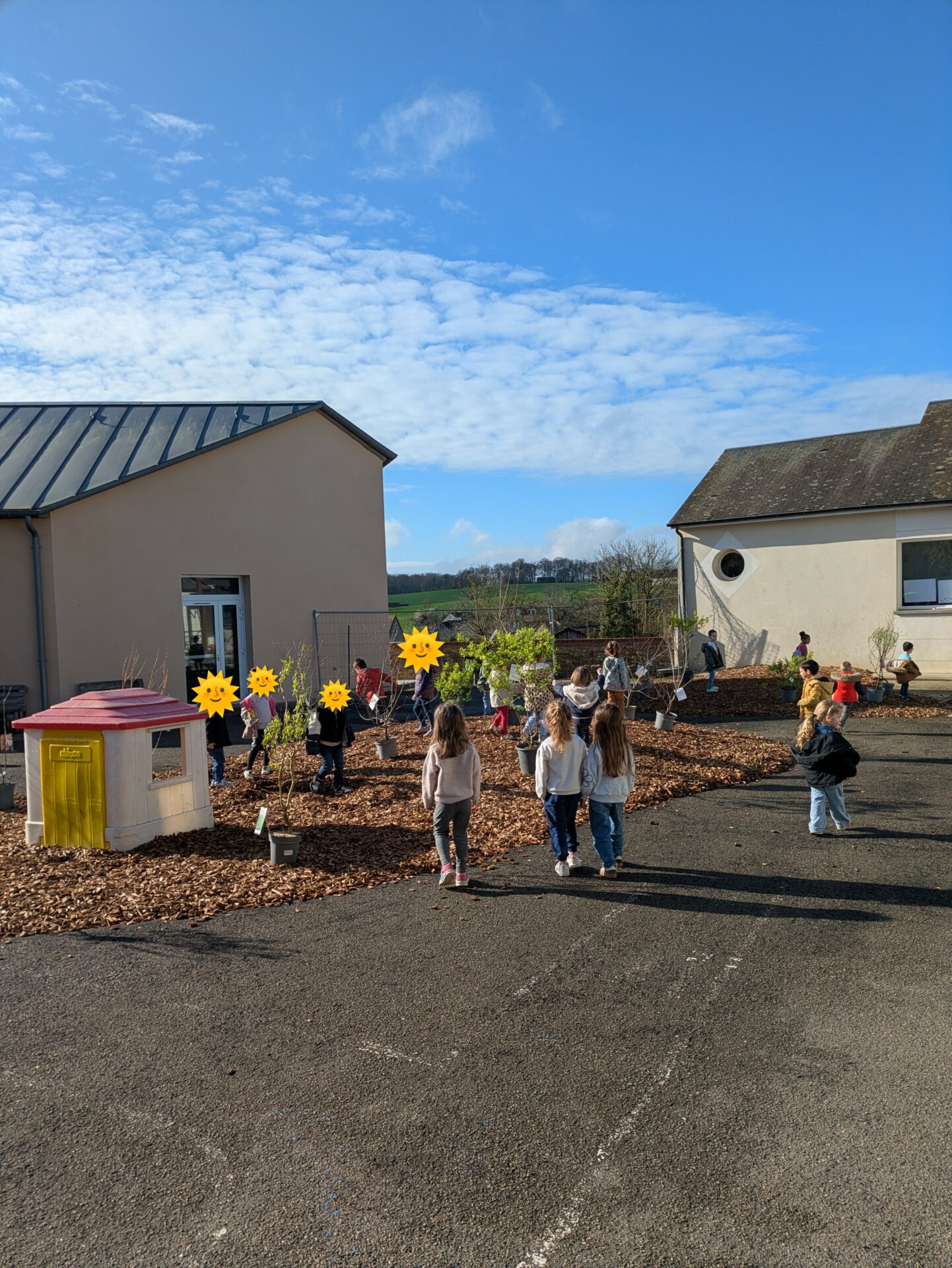 Mardi, les enfants ont participé aux plantations : petits fruitiers (groseilliers, cassissiers, fraisiers, mûriers sans épines) et plantes grimpantes (houblons, passiflores, clématites, jasmin étoilé, akebia). Les plantations et les tuteurs ont ensuite été finalisés.