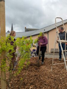 Lundi, les plants choisis aux Serres Mancelles ont été livrés par Damien dans la cour. Grâce également à l’apport de fumier ancien mis à disposition par Nadège pour enrichir la terre, l’équipe de Julia et Corène a pu préparer le terrain avant de lancer, l’après-midi, un chantier participatif ouvert aux habitants. Saules, amélanchiers et érables champêtres ont ainsi été plantés.