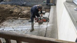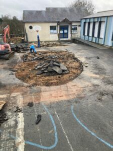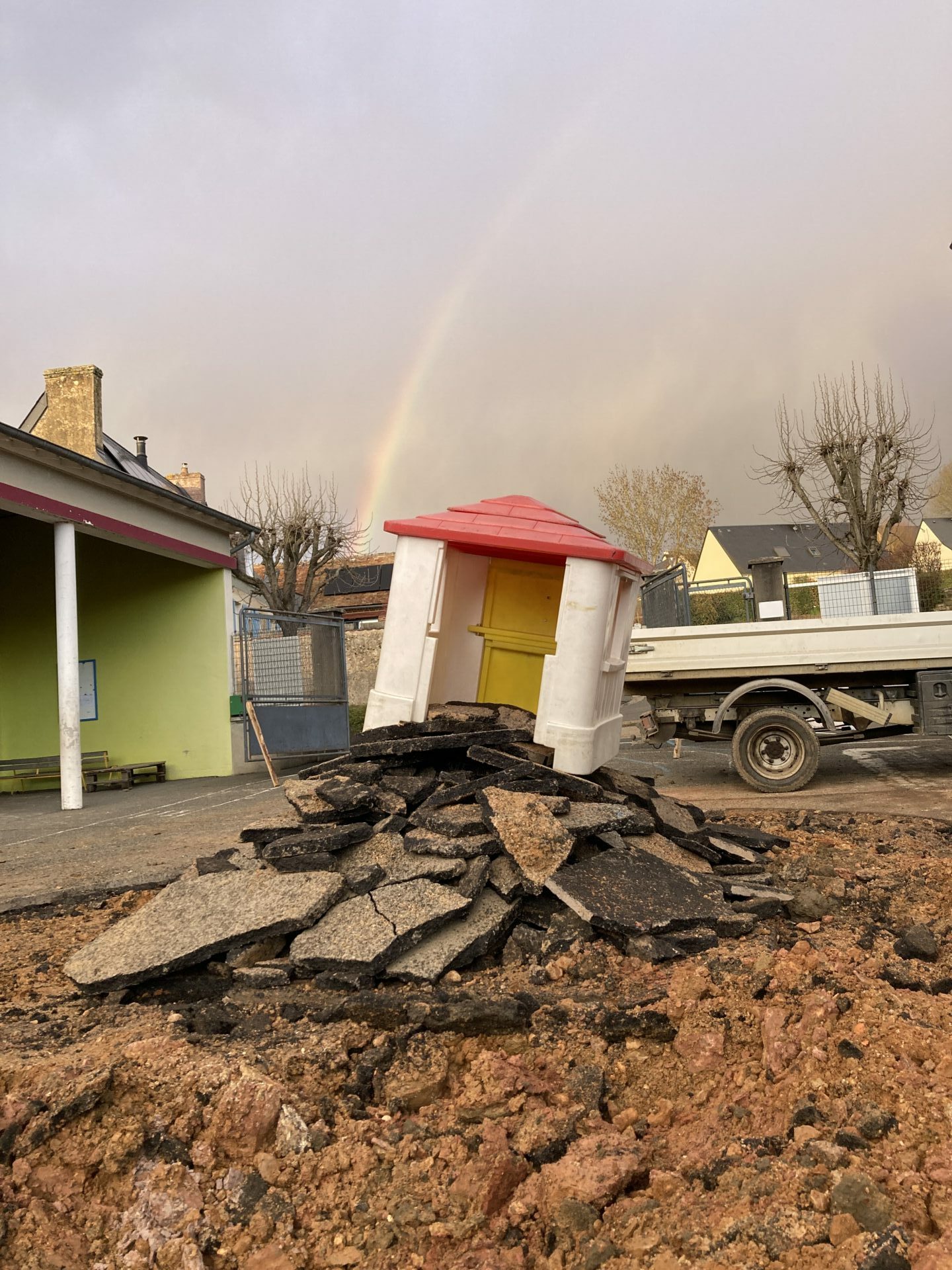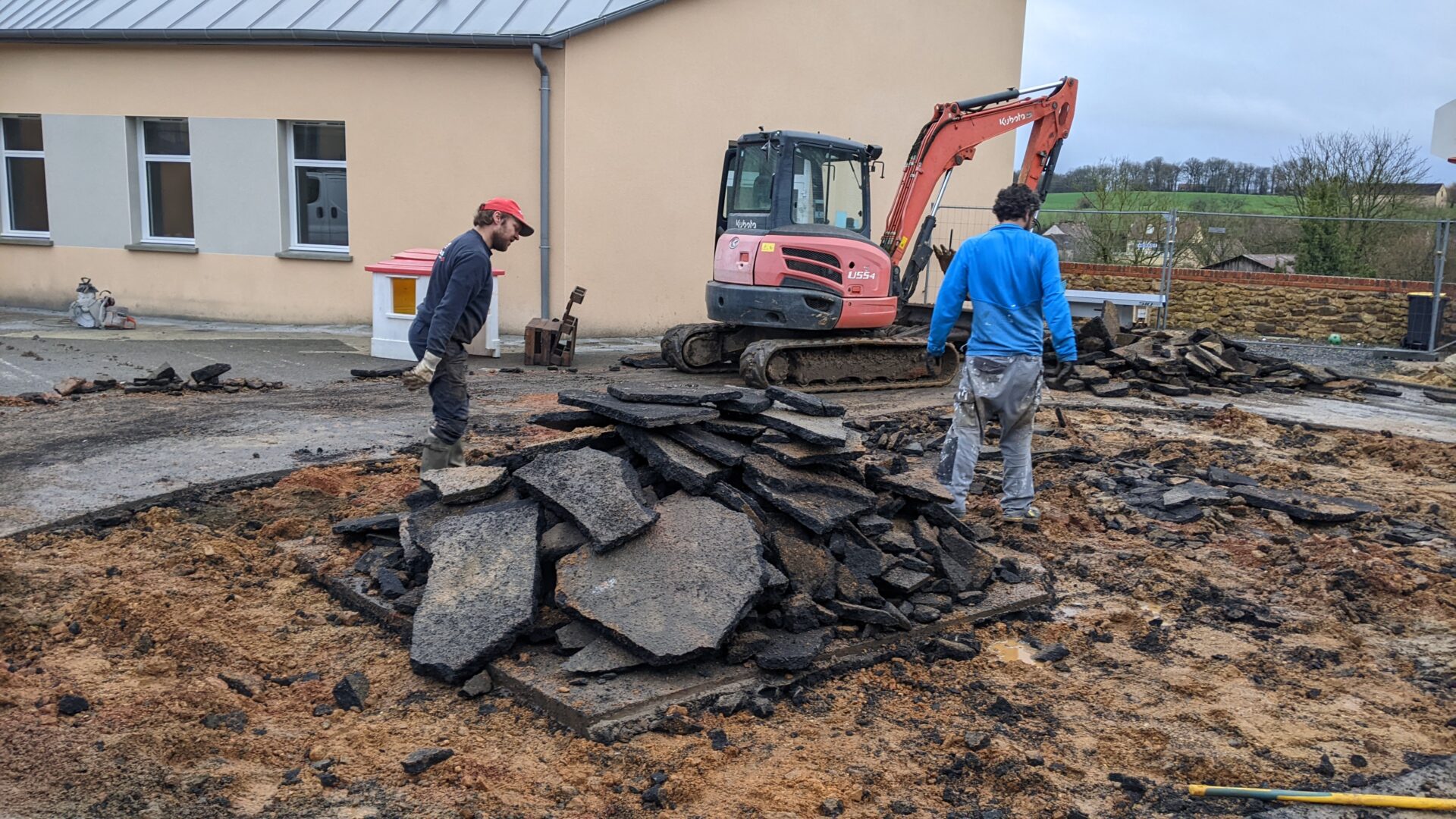 Suite aux ateliers avec les enfants au mois de janvier le projet de la nouvelle cour se dessine petit à petit, une grosse étape vient d’être franchie : le débitumage ! Pendant 4 jours Arthur, Nicolas et Damien ont coupé, creusé, nivelé pour désimperméabiliser ce nouvel espace qui devrait devenir au fil des saisons un îlot de fraîcheur en été et un terrain d’aventure en toute saison.